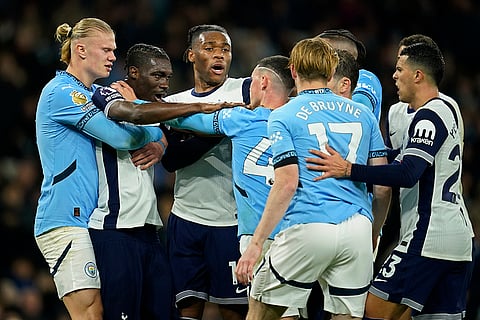 Manchester City's Erling Haaland, left, holds back Tottenham's Yves Bissouma as he tussles with Manchester City's Phil Foden, 4th left during the English Premier League soccer match between Manchester City and Tottenham at the Etihad Stadium in Manchester, England.