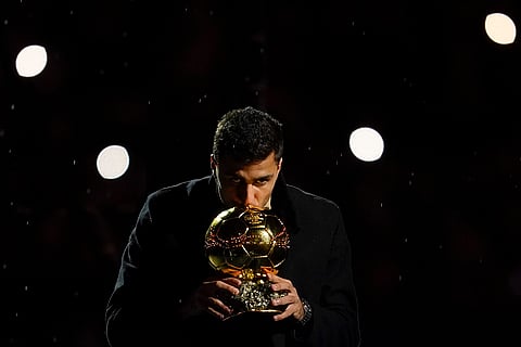 Manchester City's Rodri kisses off his Ballon d'Or (Golden Ball) award before the start of the English Premier League soccer match between Manchester City and Tottenham at the Etihad Stadium in Manchester, England.