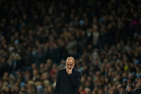 Manchester City's head coach Pep Guardiola reacts during the English Premier League soccer match between Manchester City and Tottenham at the Etihad Stadium in Manchester, England.