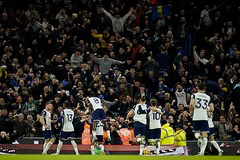 Tottenham's Pedro Porro, 3rd lower left, celebrates with teammates in front of their fans after scoring his side's third goal during the English Premier League soccer match between Manchester City and Tottenham at the Etihad Stadium in Manchester, England.