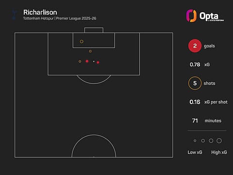 He accumulated just 0.8 expected goals (xG) against Burnley, having five shots overall. Only three players had more attempts on the opening weekend than Richarlison (six), while he had the joint-most shots on target (three, level with Man Utd's Matheus Cunha).