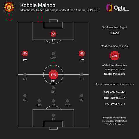 Since Amorim took charge of United, Mainoo has played 67% of his minutes in central midfield, with 33% of his playing time spent in the front three.