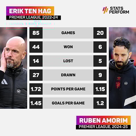 United have failed to score in eight Premier League matches since Amorim took over in November last year, with only relegation-certainties Leicester City failing to score in more games (13 for Ruud van Nistelrooy’s side).