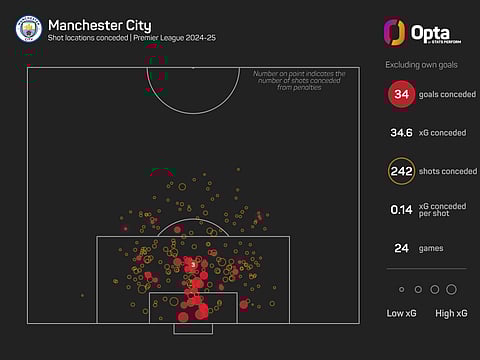 City have struggled defensively this term. Only in 2019-20 (37.6) and 2023-24 (35.9) have they had a higher expected goals against (xGA) total in a Premier League season under Guardiola than in 2024-25 (34.6).