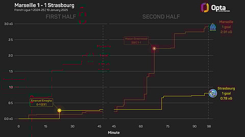 But their equaliser came through Greenwood, who has now been involved in 15 goals in the top-flight this season with Marseille (12 goals, three assists), his highest tally in a league campaign. He also had 12 touches in the opponent's box tonight, as many as the entire Strasbourg team.