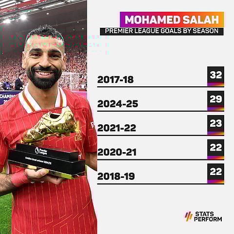 Erling Haaland's high of 36 goals in a Premier League season (in 2022-23) looked to be within Salah's sights at one point, though he ultimately finished seven adrift of that mark.
