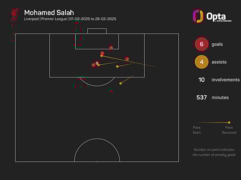 Six goals and four assists saw Salah land the Premier League's Player of the Month award for February, having had one of his most productive months of the campaign.