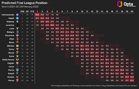 Napoli win the Scudetto in 24.2% of Opta's data-led simulations compared to Inter's 68%, while Atalanta are handed a 7.1% chance of finishing at the Serie A summit.