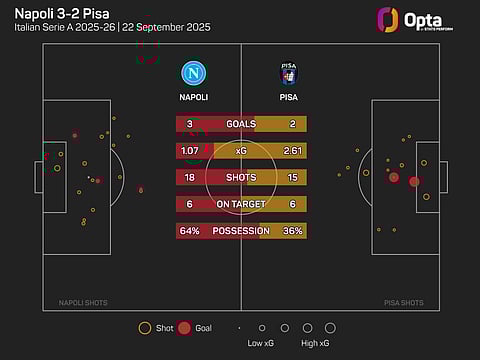 Indeed, the Scudetto holders were only able to generate an expected goals (xG) total of 0.99 from their 18 shots, six of which were on target, compared to Pisa's 2.61 from their 15 attempts, despite the visitors scoring just once coming into this game.