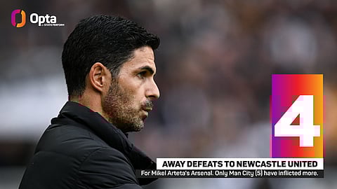 Under Arteta, Arsenal have lost four away games at Newcastle overall – going down 2-0 in May 2022, 1-0 in both November 2023 and November 2024, and 2-0 in February's EFL Cup second leg. Only against Manchester City (five) have Arsenal lost more away games under Arteta.