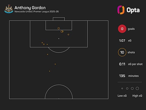 However, only David Brooks (11) has had more shots without scoring than Gordon (10) in the Premier League this season, with Gordon also one of five players to record over 1.0 expected goals (xG) without netting (1.1), despite missing three of Newcastle's five games.