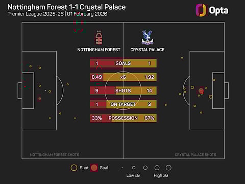 Despite having 74% possession in the second half against 10 men, Palace still had fewer shots (four vs seven) and fewer touches in the opposition box (seven vs nine) than Forest.