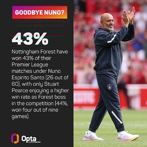 Forest have won 43% of their Premier League matches under Nuno (26 out of 60), with only Stuart Pearce enjoying a higher win rate as Forest boss in the competition (44%, won four out of nine games).