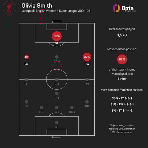 But Smith's hefty fee will dictate that she gets plenty of minutes, and she is capable of operating across the frontline, having played 62% of her WSL minutes as a central striker last season. She played 37% on the right flank and 1% on the left.