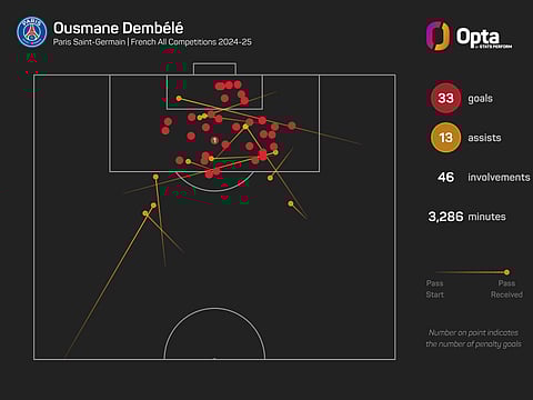 The Frenchman scored 33 goals and provided 13 assists for PSG last term. Among all players from Europe's top five leagues, only Mohamed Salah (57), Raphinha (56), Harry Kane (49) and Kylian Mbappe (48) bettered Dembele's 46 total goal involvements.