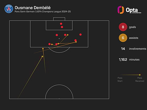 Only Barcelona's Raphinha (13 goals, eight assists) and Borussia Dortmund striker Serhou Guirassy (13 goals, four assists) bettered Dembele's 14 goal involvements in the 2024-25 tournament.