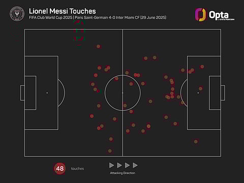 Messi desperately attempted to drive his team forward after half-time, ending the game with the joint-most shots of any player on the pitch (four, level with Hakimi and Barcola). His 17 passes in the final third were the most of any Miami player.