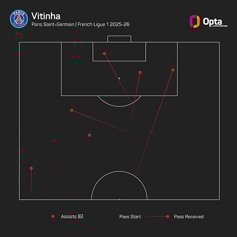 Vitinha has provided six assists in Ligue 1 this season, his highest tally over a single league campaign in his career and the joint-most in the big-five European leagues in 2025-26, alongside Luis Milla and Marcus Rashford.