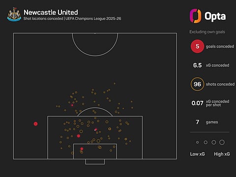 Only Arsenal (5.0) and Liverpool (6.2), meanwhile, can boast a lower xG against figure than Newcastle's impressive 6.4, and Howe's back line will have to be at its best to keep out a team that has registered the most shots (148) and shots on target (54) in the Champions League this term.