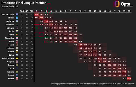 Juventus are currently given a 68.6% chance of finishing in the top four, with their current position of fourth the most likely result (48.5%) according to the Opta supercomputer.