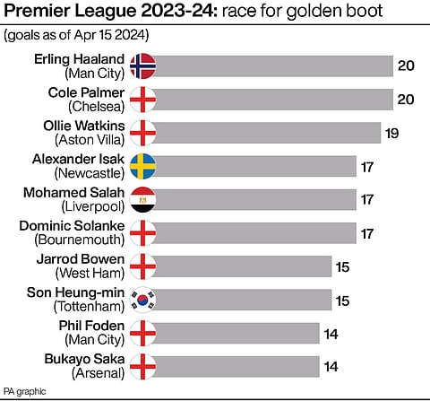Further down the scoring charts, West Ham’s Jarrod Bowen has enjoyed a stellar campaign with 15 goals while Manchester City midfielder Phil Foden has netted 10 goals since Christmas to take his tally to 14 overall.