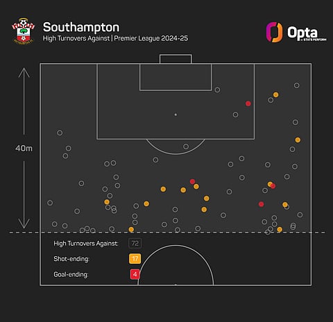 Southampton's opponents, meanwhile, have forced turnovers through pressures in the final third on 81 occasions. Only Brentford, Chelsea (both 91) and United (82) have given up more.