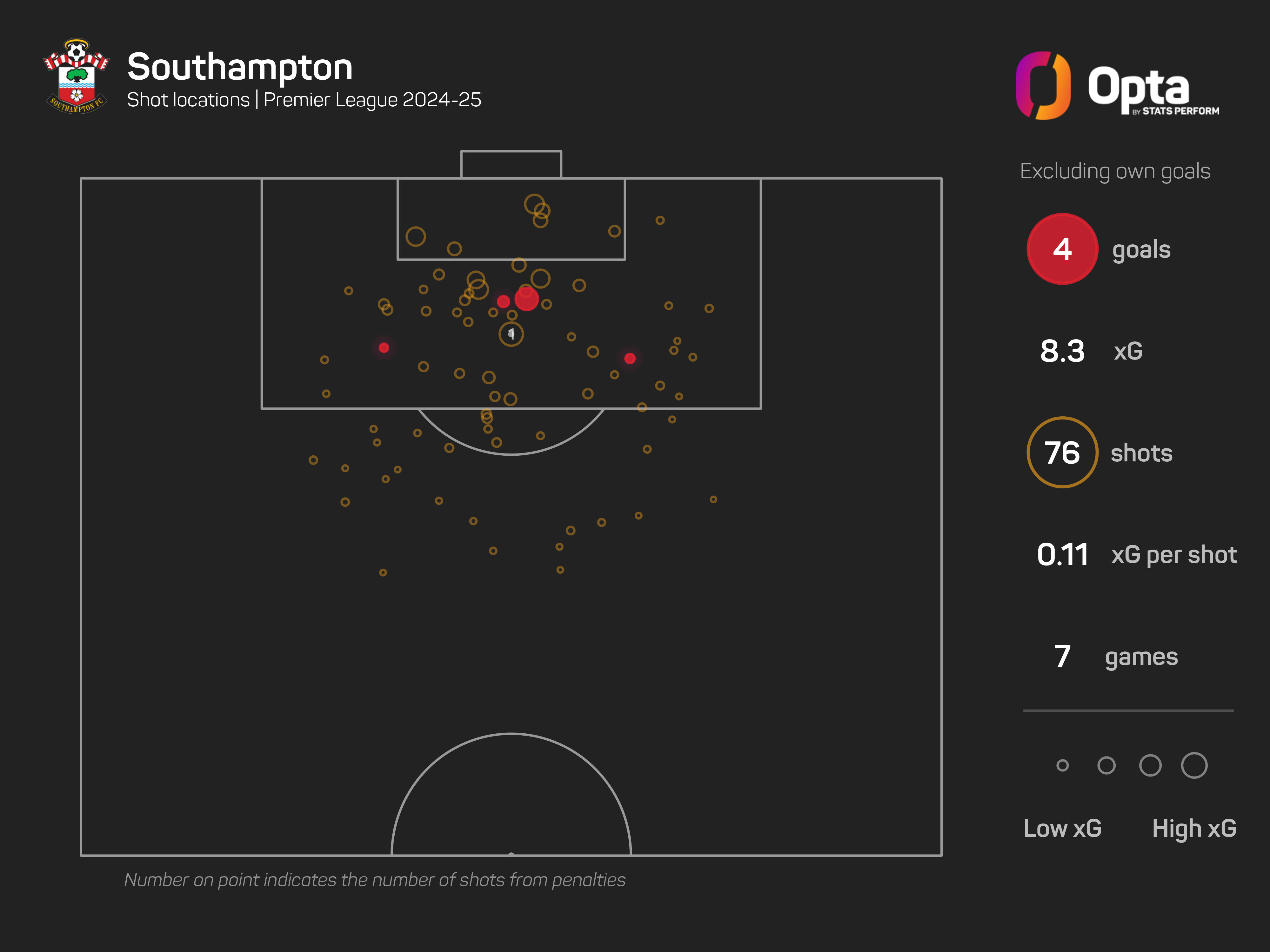 Missing chances has not been Southampton's only issue, with their 165 touches in the opposition box being the sixth-fewest in the league, despite their 5,117 total touches being the fourth-most.
