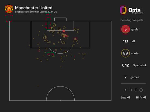 United's five goals have come from 11.11 xG, making them the league's highest underperformers, scoring 6.11 goals fewer than expected given their quality of chances created. Their shot conversion rate of 5.62%, meanwhile, is worse than all but Southampton (5.26%) and Palace (5.43%), who are both winless.