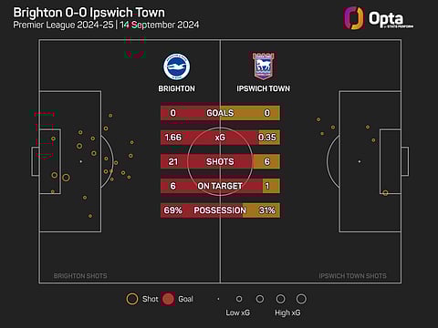 The Seagulls had a whopping 21 shots at the Amex Stadium, but accumulated just 1.66 xG, and only managed to test Arijanet Muric on six occasions despite their continued dominance.