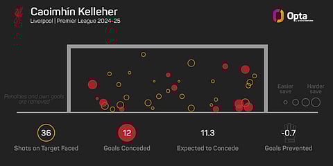 Liverpool kept four clean sheets with Kelleher between the sticks, with his save percentage of 67.57% putting him 12th among all goalkeepers to play at least 10 matches.