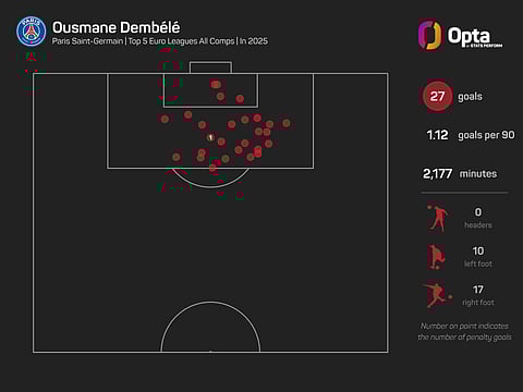 Ousmane Dembele has been involved in more goals than any other player in Europe's big five leagues in all competitions in 2025 (36 – 27 goals, nine assists).