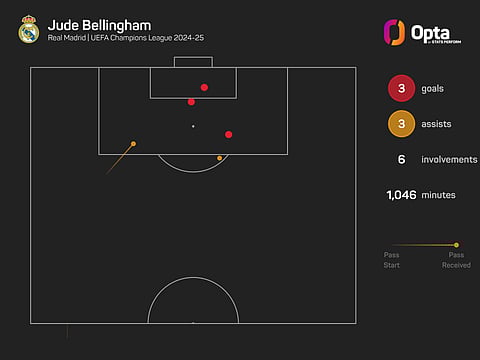 Florian Wirtz and Michael Olise (both seven) are the only midfielders with more Champions League goal involvements than Bellingham's six this term, and he relishes these big occasions.