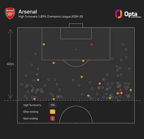 Despite having more possession, with a 53.4% share, Arsenal made 115 high-intensity pressures in the final third last Tuesday.