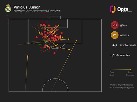 Vinicius Junior was scarcely involved in the first leg, but he is one Champions League goal involvement from reaching his half-century (currently 49 – 28 goals, 21 assists).