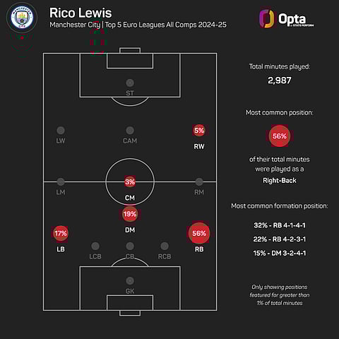 Lewis has made 41 appearances for City in all competitions this season, with only Josko Gvardiol (48), Ilkay Gundogan (46), Bernardo Silva (44) and Savinho (42) having more.