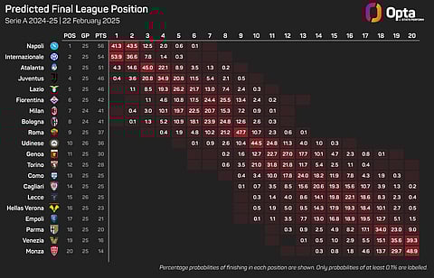 Despite not sitting at the summit, Inter are the current favourites to retain the Scudetto, with the Opta supercomputer giving them a 53.9% chance to Napoli's 41.3%.