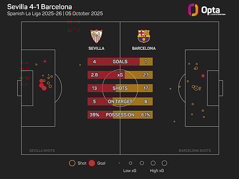 Barca were dealt a blow with Lamine Yamal ruled out of Sunday's clash through injury, and the talented teenager's absence ultimately proved decisive, despite the Blaugrana registering an expected goals (xG) total of 2.1 from their 17 attempts to Sevilla's 2.8 from their 13 shots.