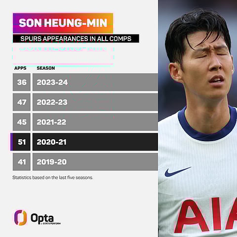 Last season, only Guglielmo Vicario (38), Dejan Kulusevski and Pierre-Emile Hojbjerg (both 36) played more games for Spurs in the Premier League than Son (35 - level with Pedro Porro).