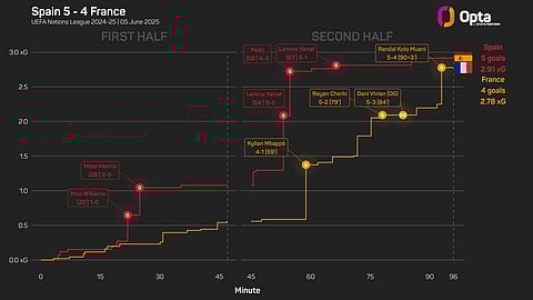 A Lamine Yamal double - along with goals from Nico Williams, Mikel Merino, and Pedri - had put Spain in control, but Mbappe's penalty was then added to by Rayan Cherki, a Dani Vivian own-goal and Randal Kolo Muani’s late header.
