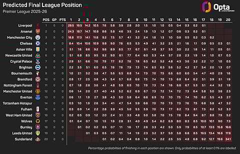 According to Opta's supercomputer, City have an 18.8% chance of regaining the title, with Liverpool made the favourites to finish first (28.5%).