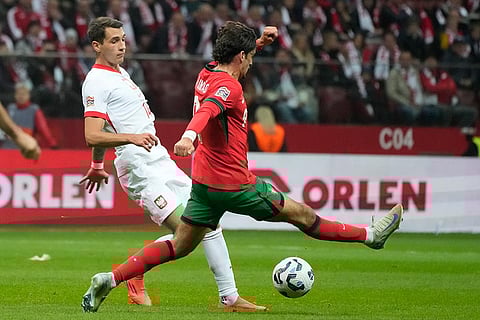 Poland's Jakub Kiwior, left, and Portugal's Francisco Trincao compete for the ball during the UEFA Nations League soccer match between Poland and Portugal at Narodowy stadium in Warsaw, Poland.