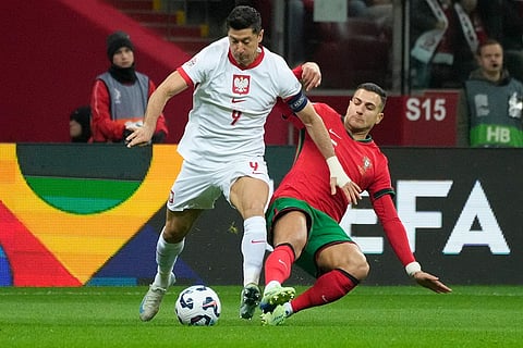 Portugal's Diogo Dalot, right, challenges Poland's Robert Lewandowski during the UEFA Nations League soccer match between Poland and Portugal at Narodowy stadium in Warsaw, Poland.