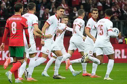 Poland's Piotr Zielinski, center, is congratulated after scoring his side's first goal during the UEFA Nations League soccer match between Poland and Portugal at Narodowy stadium in Warsaw, Poland.
