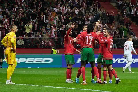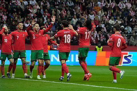 Portugal's Rafael Leao (17) is congratulated after assisting Cristiano Ronaldo for his side's second goal during the UEFA Nations League soccer match between Poland and Portugal at Narodowy stadium in Warsaw, Poland.