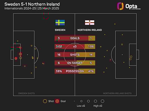 Sweden only just outshot Northern Ireland, having 16 attempts and facing 14, though their chances had a total value of 3.02 expected goals (xG) to Northern Ireland's 1.06.