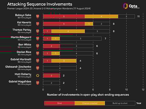 The England winger was involved in 11 attacking sequences against Wolves on matchday one, more than any other player on the pitch, ahead of Havertz and Thomas Partey (eight apiece).