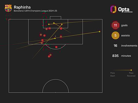 Raphinha has been directly involved in 16 goals in 10 appearances in the Champions League this season (11 goals, five assists) and is the competition's top scorer.