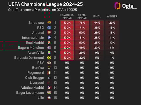 Dortmund, meanwhile, are given a 22% chance of reaching the last four, the lowest of the eight teams, with Aston Villa slightly ahead of them (29%).