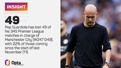 Guardiola has lost 49 of his 345 Premier League matches (W247 D49), with 22% of those defeats coming since the start of last November (11).
