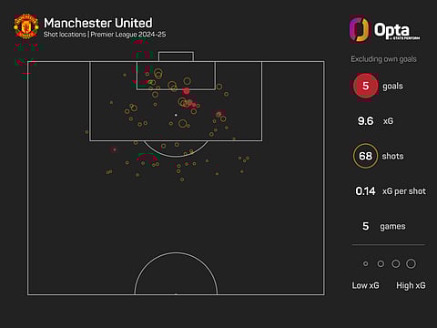 Their total expected goals (xG) figure of 9.6 for the season is the third-highest in the Premier League, behind only title contenders Manchester City (11.46) and Liverpool (10.1). However, United have only hit the net five times, giving them an xG underperformance of 4.6.